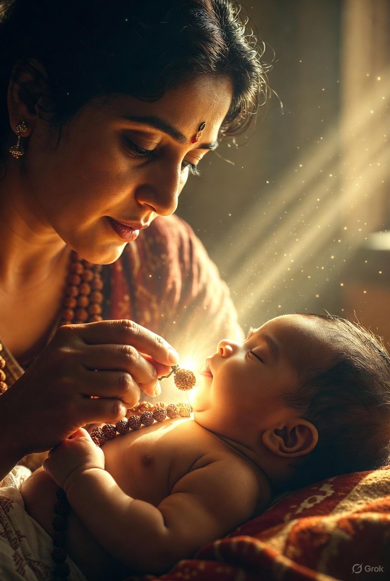 Rudraksha ko bacche ke gale ya kapdon ke saath surakshit roop se pehnaya ja sakta hai
